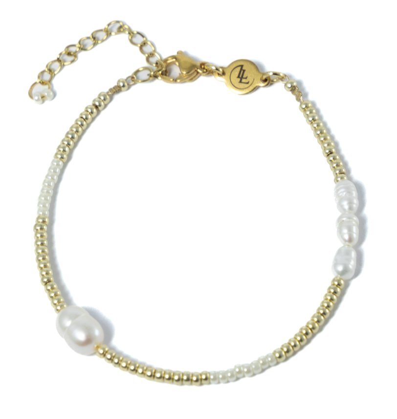 Onze mooie armband Claire. Gemaakt van gouden Miyuki-kraaltjes en gedetailleerd met parels . Ook supermooi te combineren met een van onze andere armbandjes.