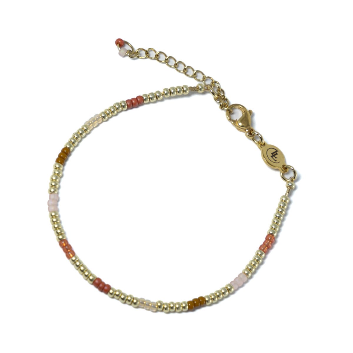 Onze mooie armband Floor. Gemaakt van gouden Miyuki-kraaltjes en gedetailleerd met glaskralen in warme najaarstinten. Ook supermooi te combineren met een van onze andere armbandjes.