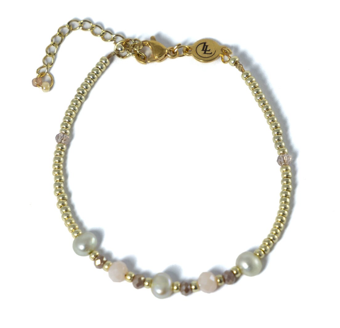 Onze mooie armband Jade. Gemaakt van gouden Miyuki-kraaltjes en gedetailleerd met parels en glaskralen in verschillende populaire roodtinten. Ook supermooi te combineren met een van onze andere armbandjes.