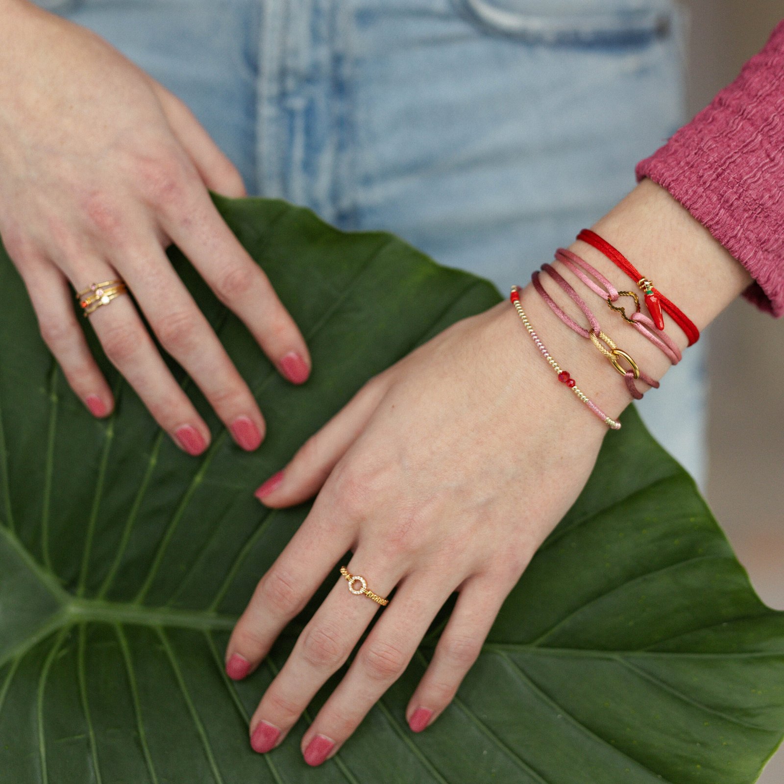 Onze mooie armband Lauren. Gemaakt van gouden Miyuki-kraaltjes en gedetailleerd met glaskralen. De kleurtinten Rood en Roze matchen fantastisch samen met het gouden in deze armband. Ook supermooi te combineren met een van onze andere armbandjes.