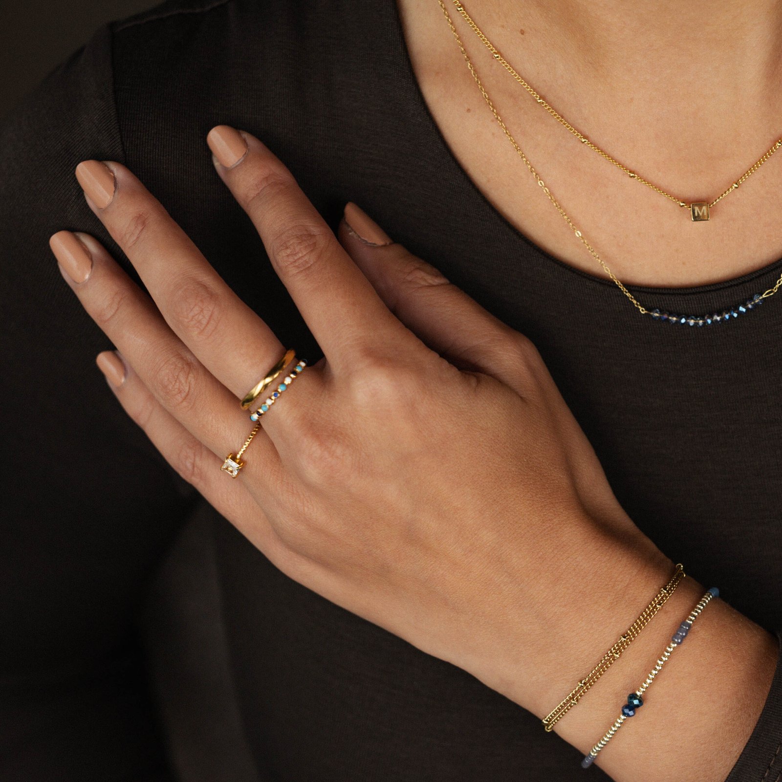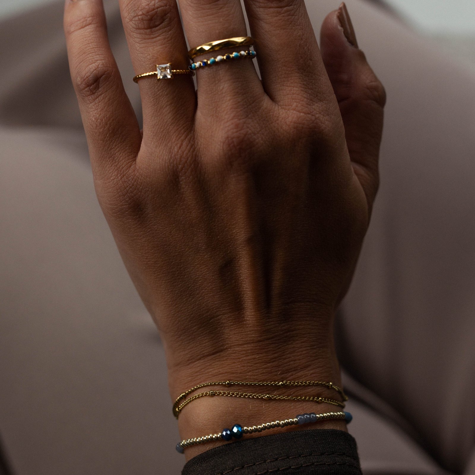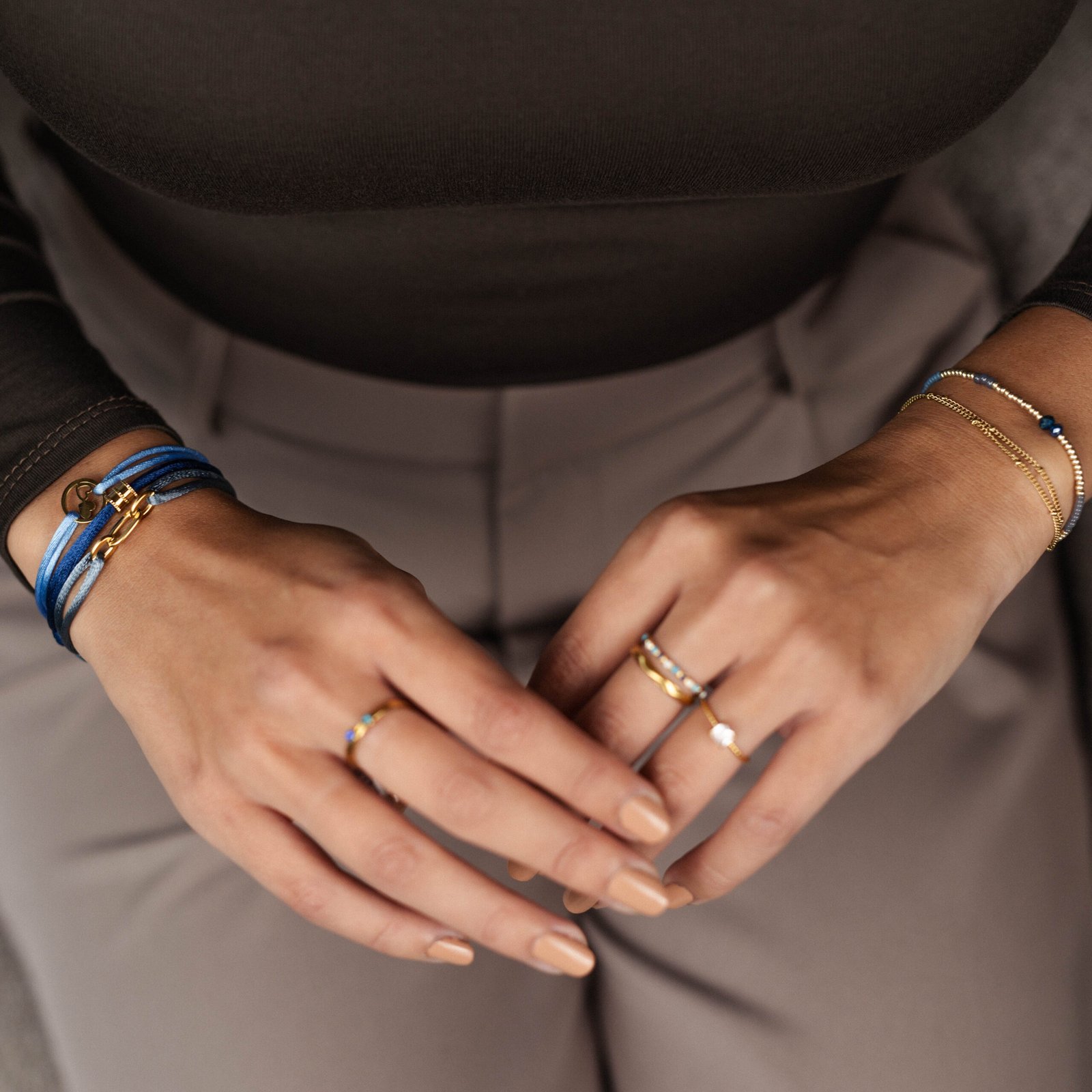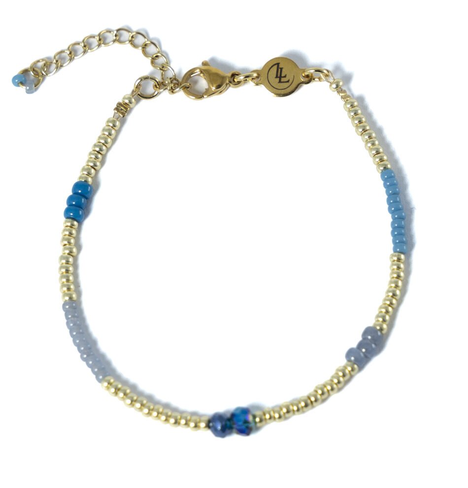 Onze mooie armband Saar. Gemaakt van gouden Miyuki-kraaltjes en gedetailleerd met prachtige glaskralen in verschillende blauwtinten.