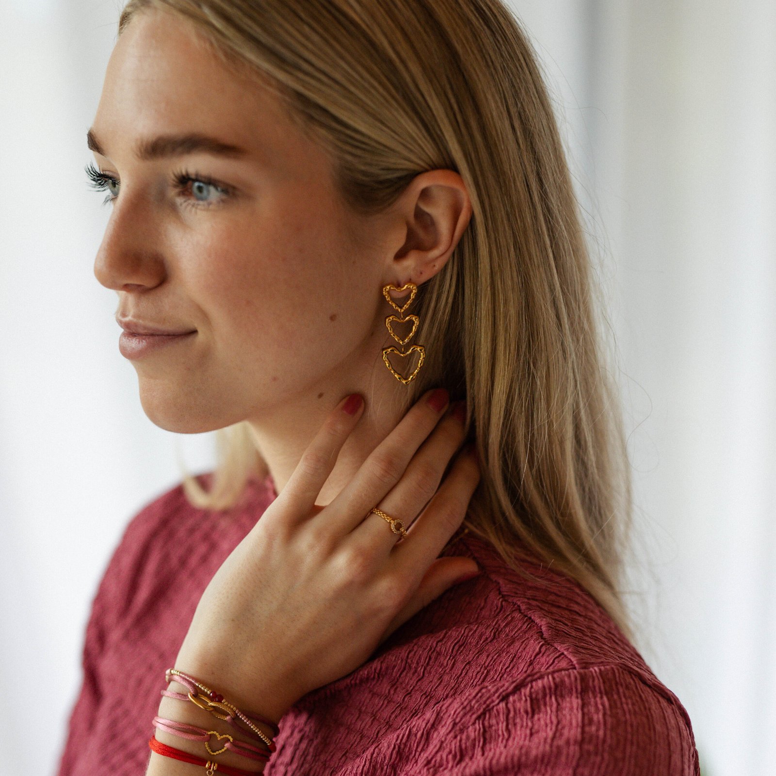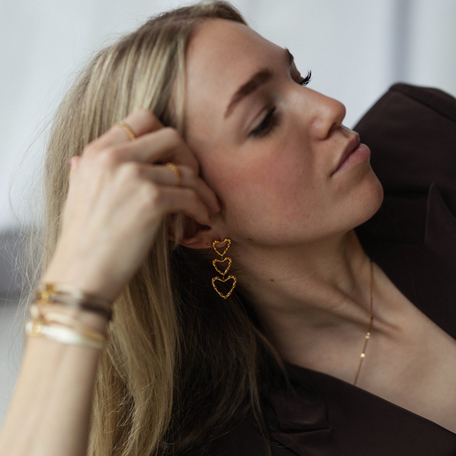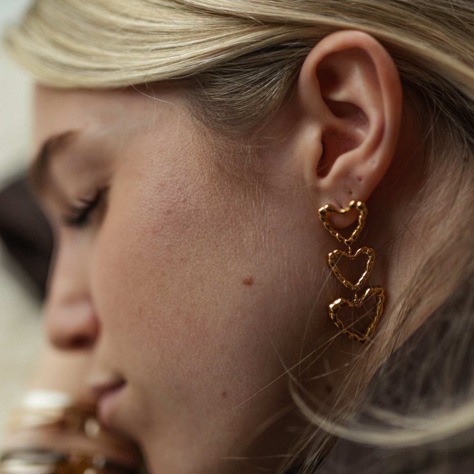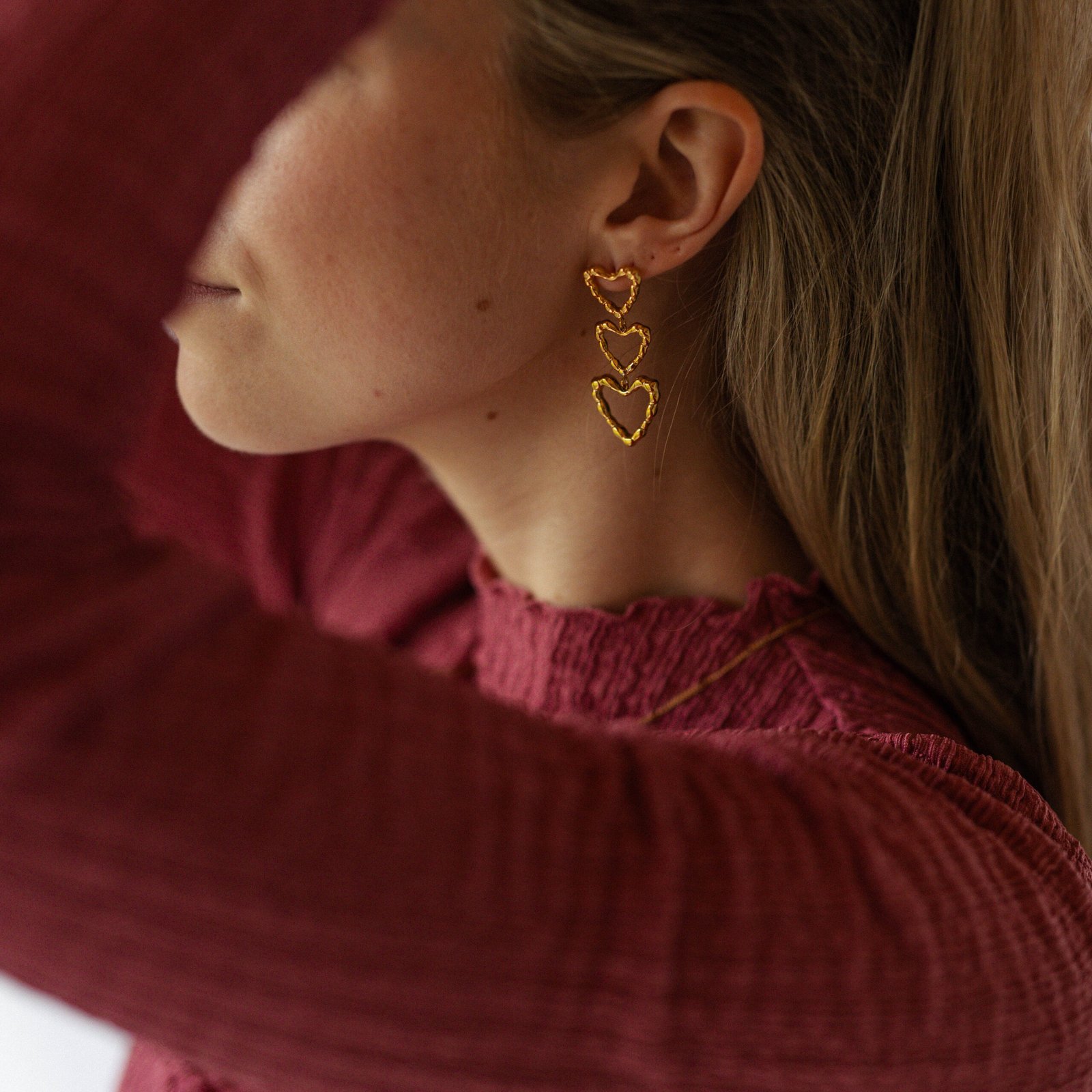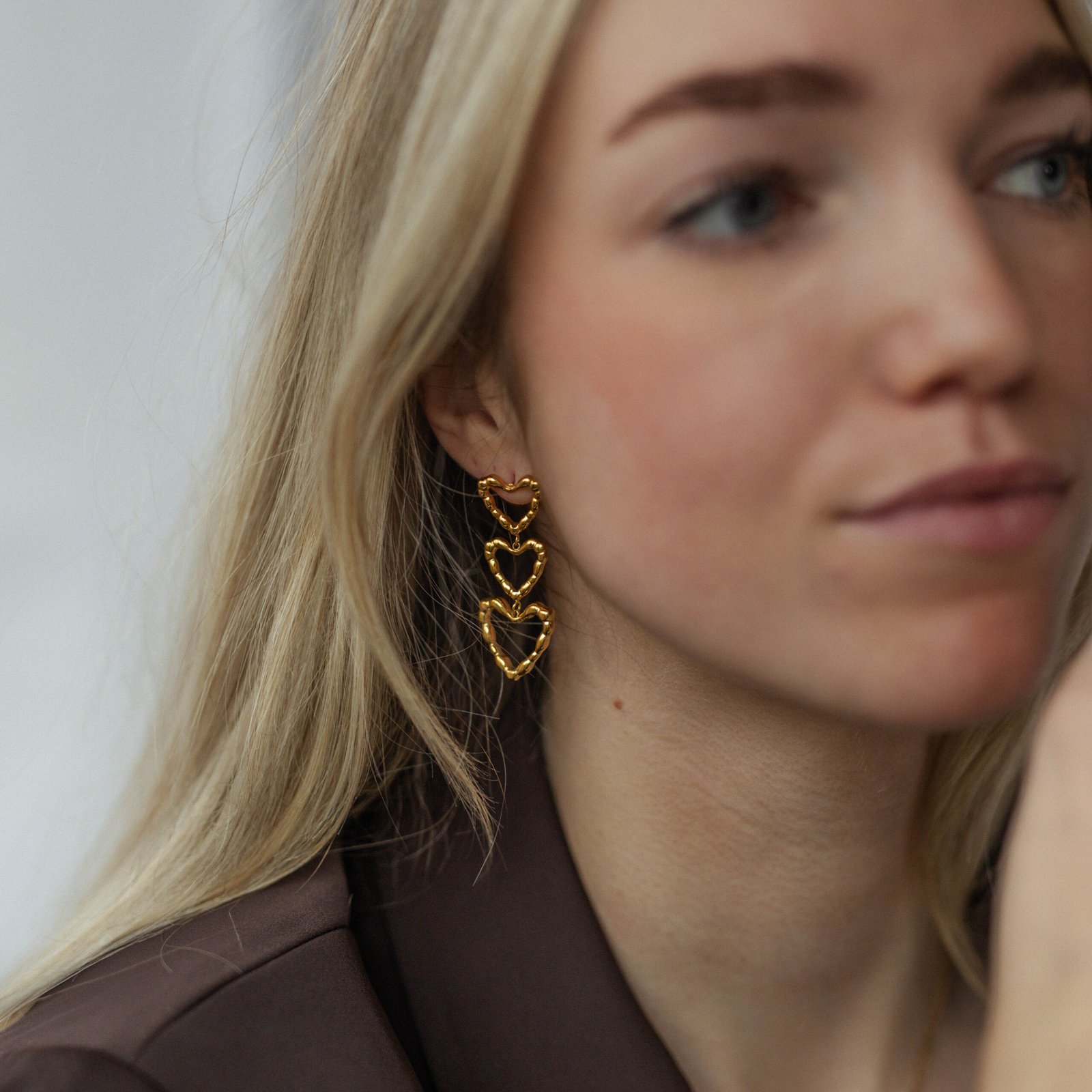 Steel de show met deze prachtige statement oorbellen. Drie hartjes onder elkaar.
